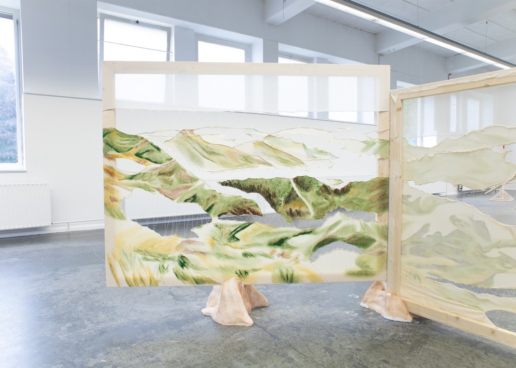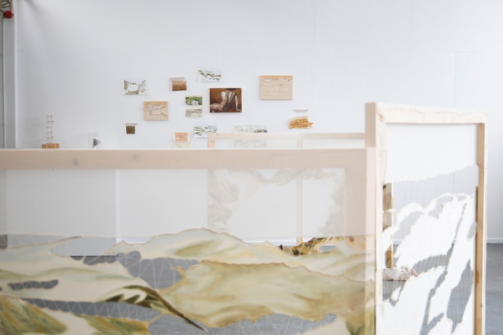 “Going back”, 2023 exhibition view exhibition view – research shown on wall 140×180 cmPaintings: selfmade oil paint, pigments, cotton yarn, cotton canvas, textiles, woodSculptures: tempera and pigments on plaster