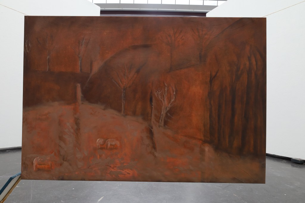 The pigments are made from charcoal, and from stones found on the side of the road, where she regularly walks, close to her parents’ home. Different stones gave different colours and structures. The structures you can specifically see well from up close, or in the pictures scrolling down to the next picture >
