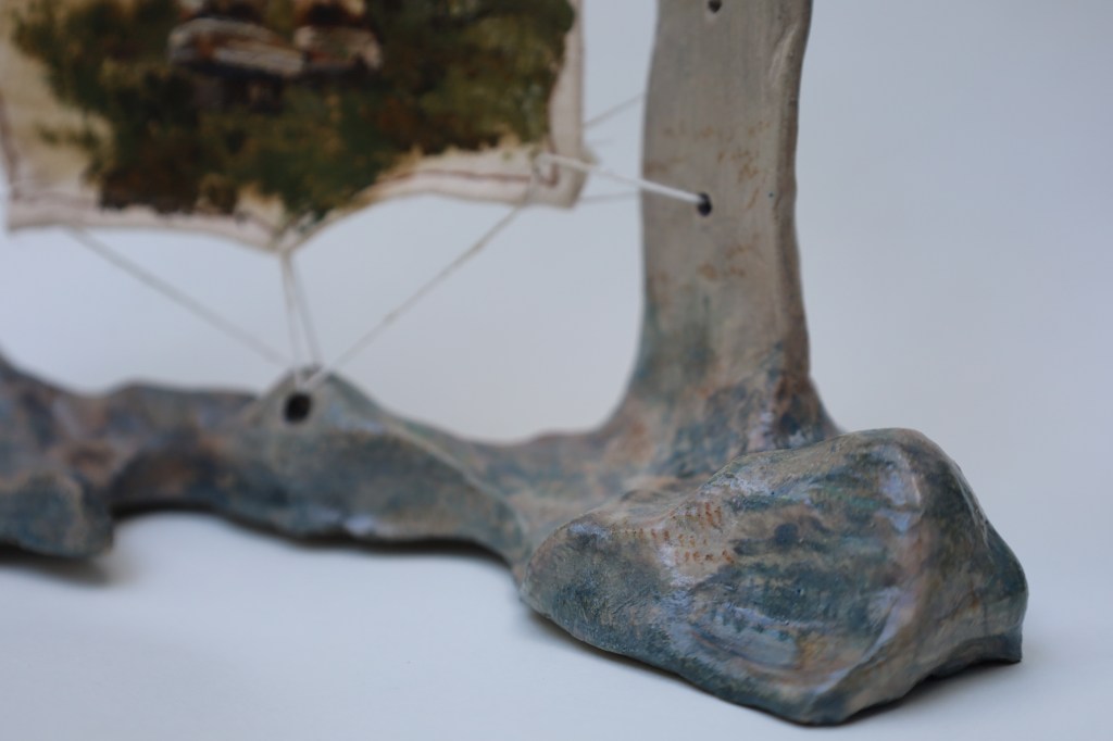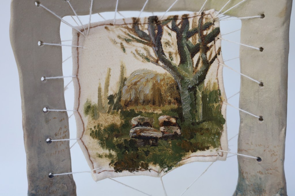 “Van de bergen naar het notenbos”, 2025 22 x 18 x 12 cmglazed ceramic frame, oil paint on cotton canvas