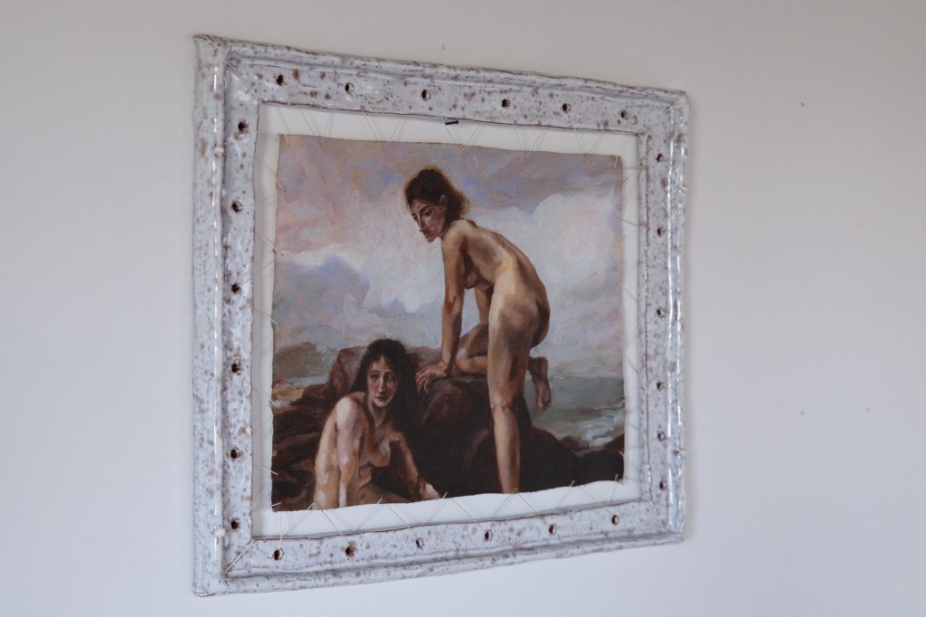 oil paint and charcoal on cotton canvas, cotton yarn, glazed ceramic frame